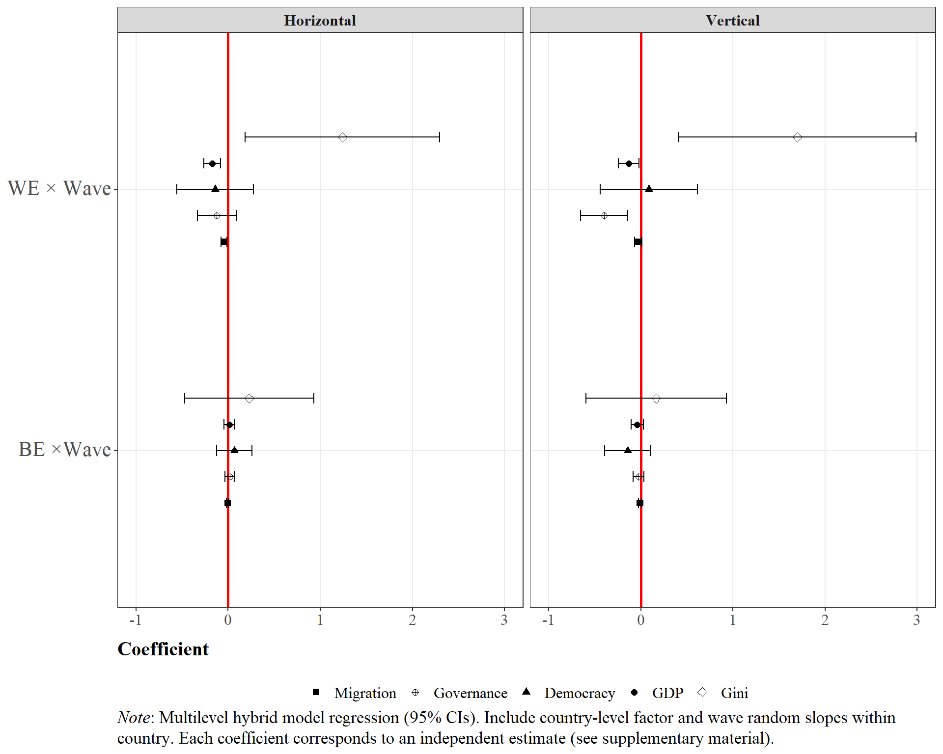 Economic, institutional, and cultural factors were included as independent variables. Recognizing the hierarchical structure of the data, predictors were considered at the individual level, at the wave-country level, and at the country level.