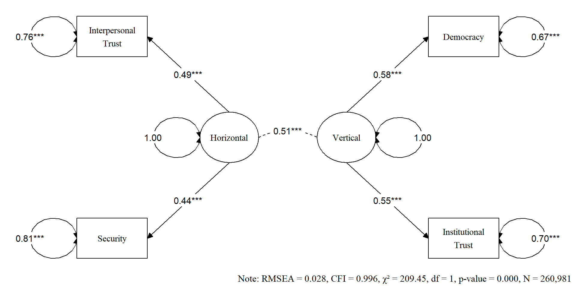 A confirmatory factor analysis was performed to test the model constructed by the Social Cohesion Observatory (2025) and the theoretical proposal by Chan et al. (2006). As can be seen in Figura 1, social cohesion is understood as a latent construct consisting of two latent dimensions: vertical cohesion and horizontal cohesion.