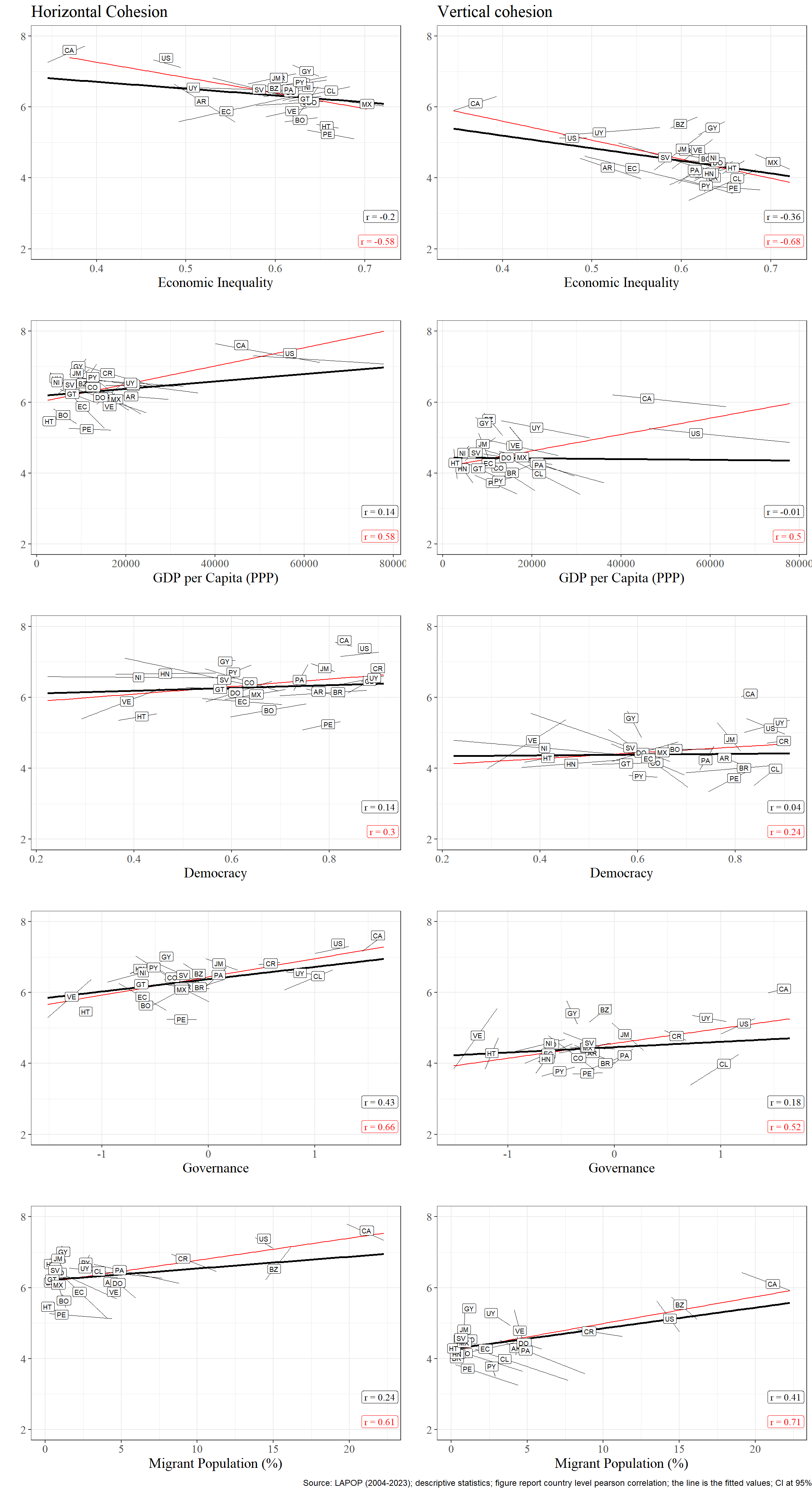 Este artículo busca cubrir esas brechas proponiendo y validando un modelo de medición que permita un análisis comparativo, longitudinal y multinivel de la cohesión social en América Latina. En concreto, buscamos avanzar en: (i) una operacionalización clara y validada que integre dimensiones claves a partir de la literatura existente y los datos disponibles para la región; (ii) la estimación de trayectorias regionales y nacionales durante las últimas dos décadas; y (iii) la identificación de factores asociados a estos cambios mediante la aplicación de modelos de regresión multinivel híbridos. Con esto, se espera aportar evidencia robusta sobre los cambios en la región en las últimas dos décadas, aportando a la discusión académica y política sobre los desafíos y oportunidades de la cohesión social en América Latina.