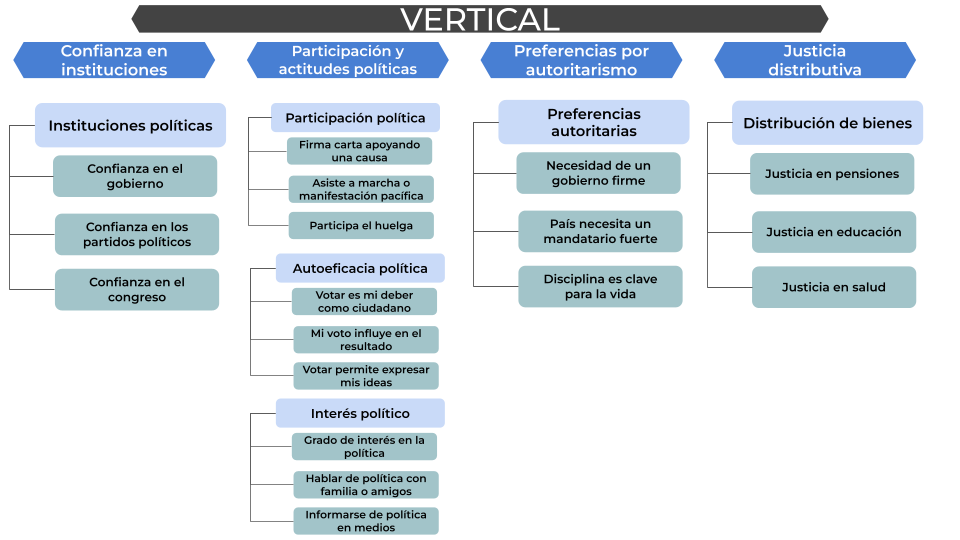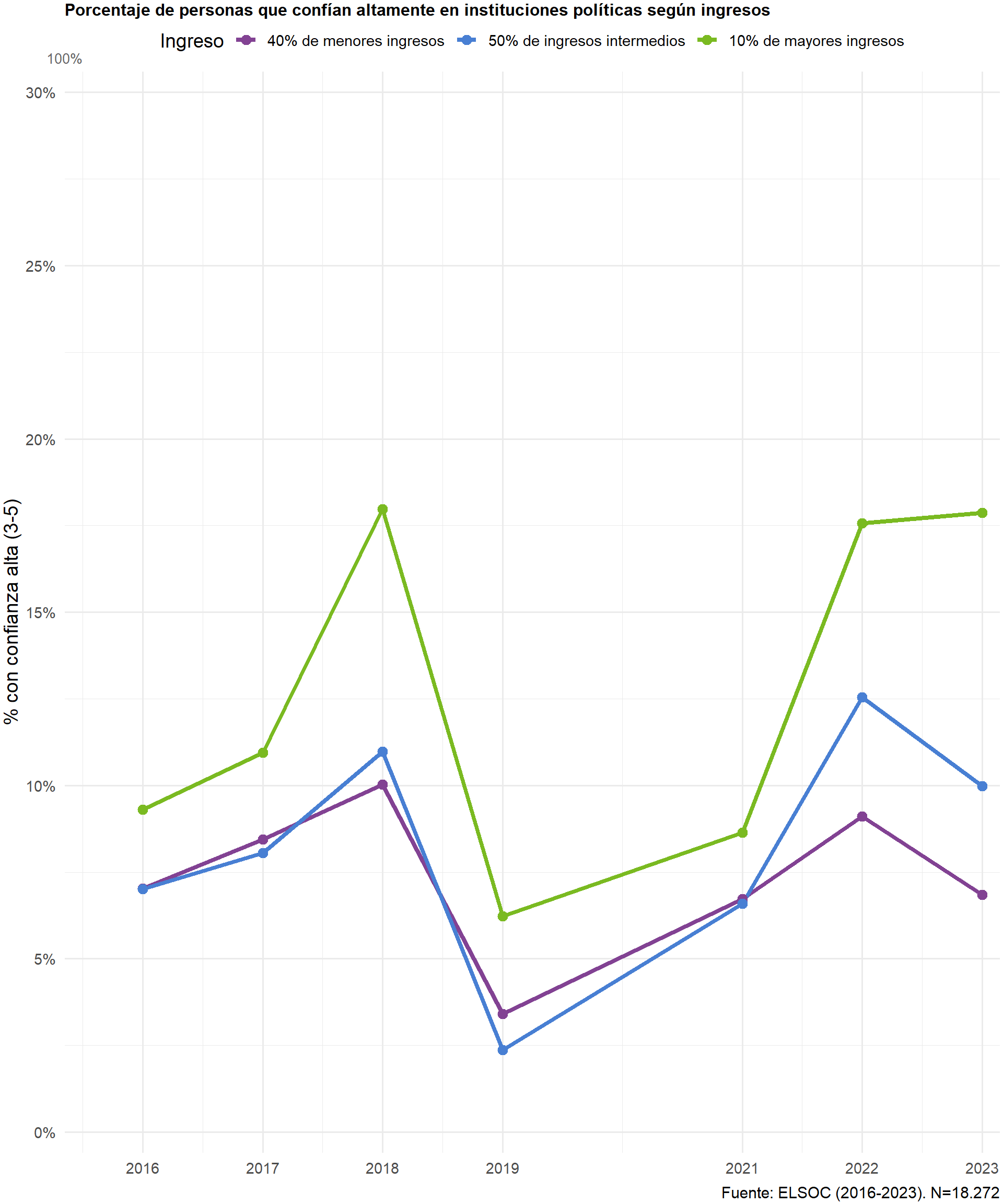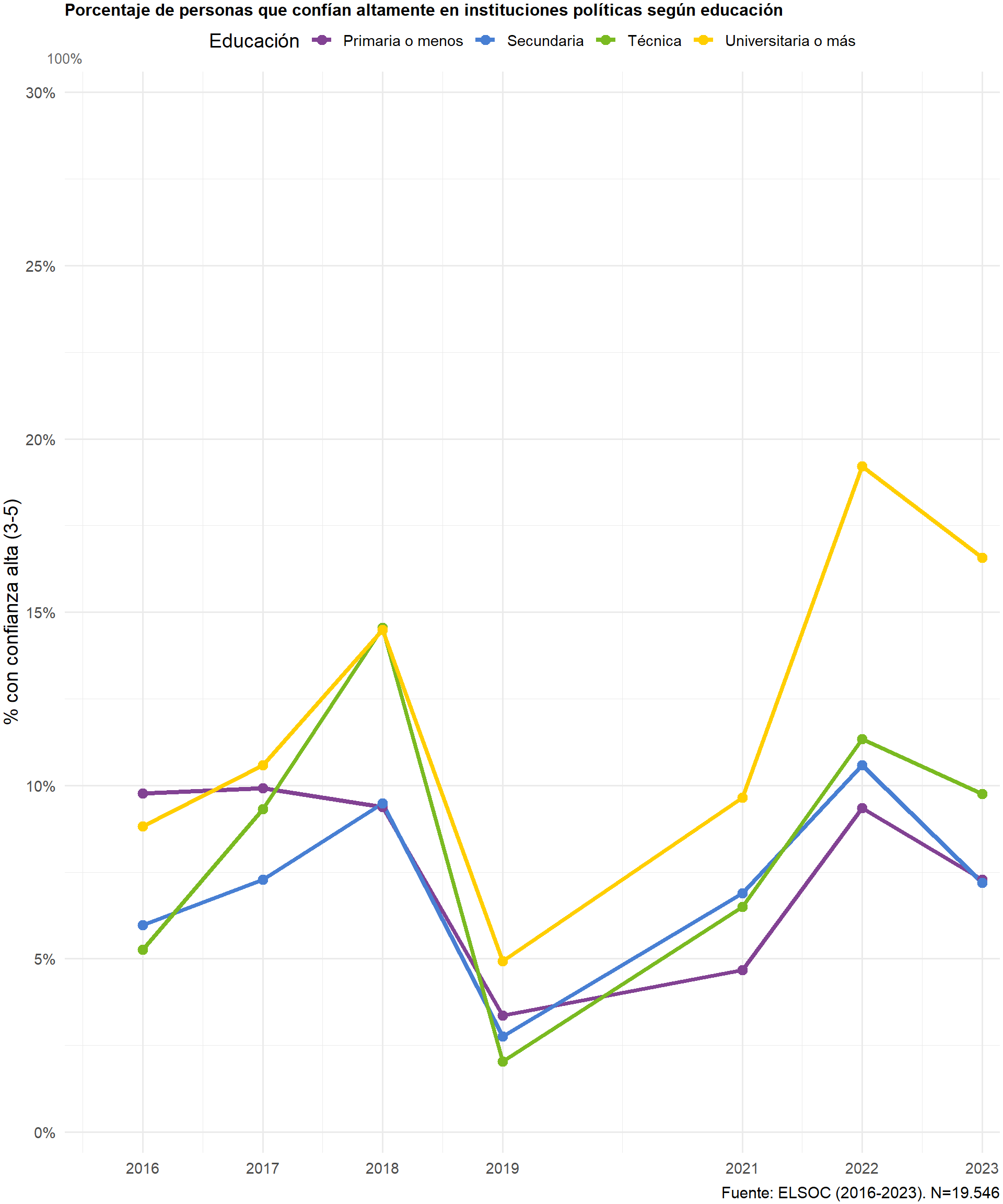 En el plano vertical —relación ciudadanía–instituciones— consideramos 4 dimensiones: (i) confianza en instituciones políticas; (ii) prácticas y actitudes políticas (participación, autoeficacia e interés); (iii) preferencias por sistema político (autoritarismo vs. democracia); y (iv) justicia distributiva (preferencias sobre la provisión de bienestar social por el mercado). Este conjunto integra prácticas y orientaciones, capturando variaciones longitudinales. Tras esta sección se muestran cruces análogos por ingreso y educación para la dimensión de Confianza en las Instituciones Políticas también disponibles en el Visualizador ELSOC del Observatorio de Cohesión Social (OCS) para su exploración.