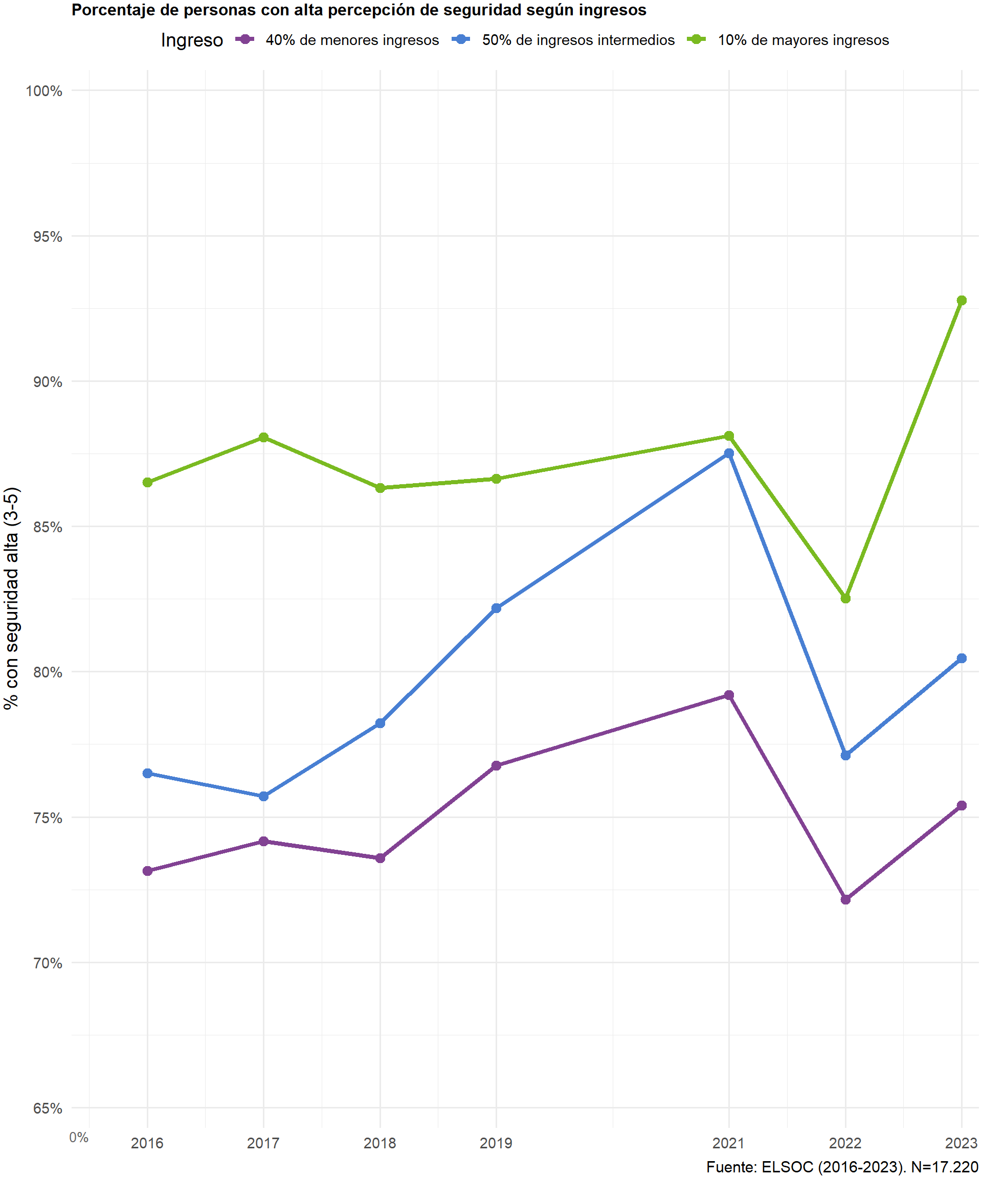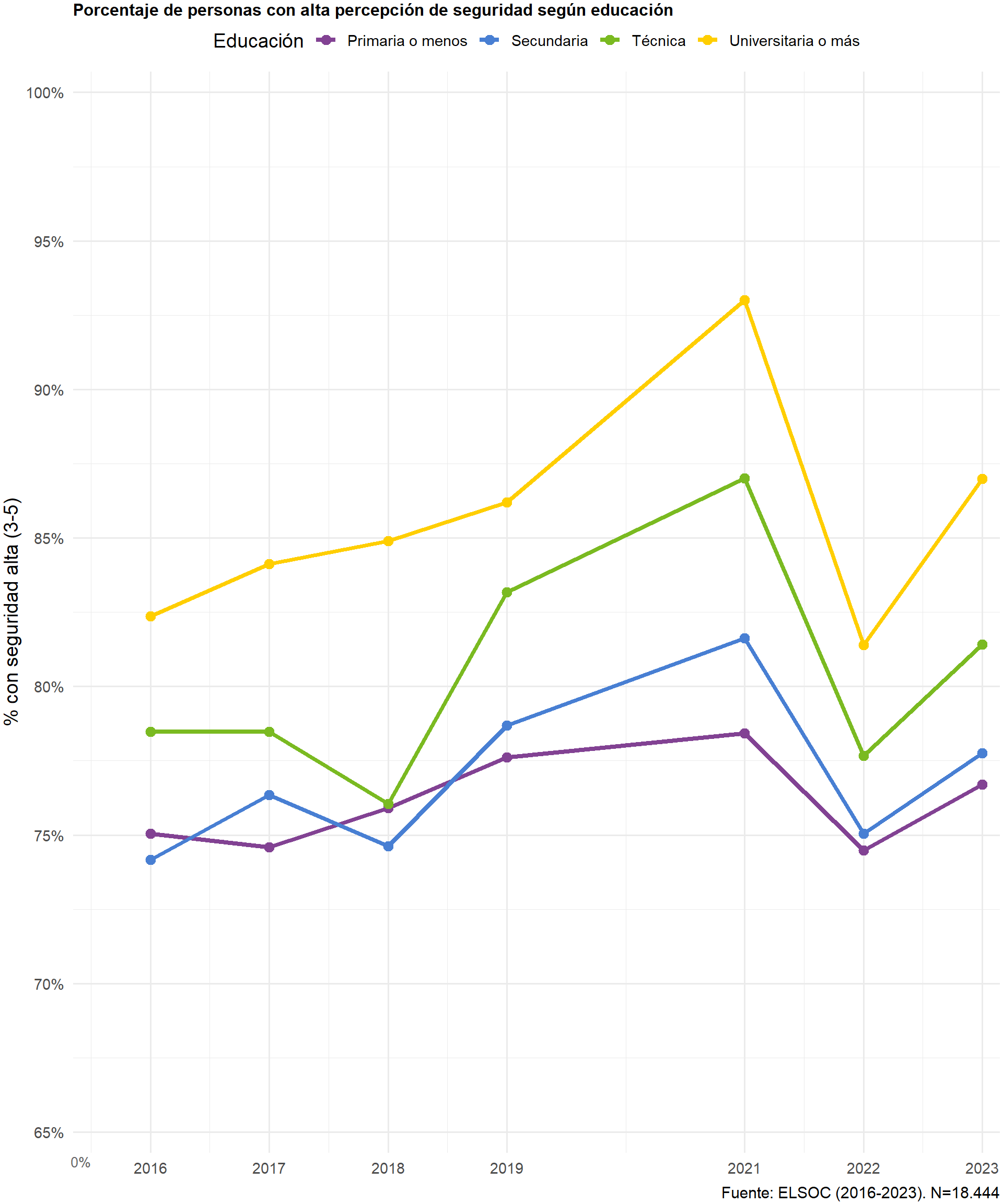Las trayectorias de seguridad muestran convergencia en 2016–2018 y peaks similares en 2019 (≈47–50% bajos, ≈57% medios, ≈61% altos). Tras 2019 hay una caída generalizada con estratificación persistente: en 2023 altos ≈61%, medios ≈52% y bajos ≈43%. En conjunto con la confianza institucional, 2019 es un punto de inflexión; la seguridad cambia de forma más gradual y las brechas por estatus (ingreso/educación) se mantienen o se amplían, con niveles sistemáticamente mayores entre los grupos aventajados.